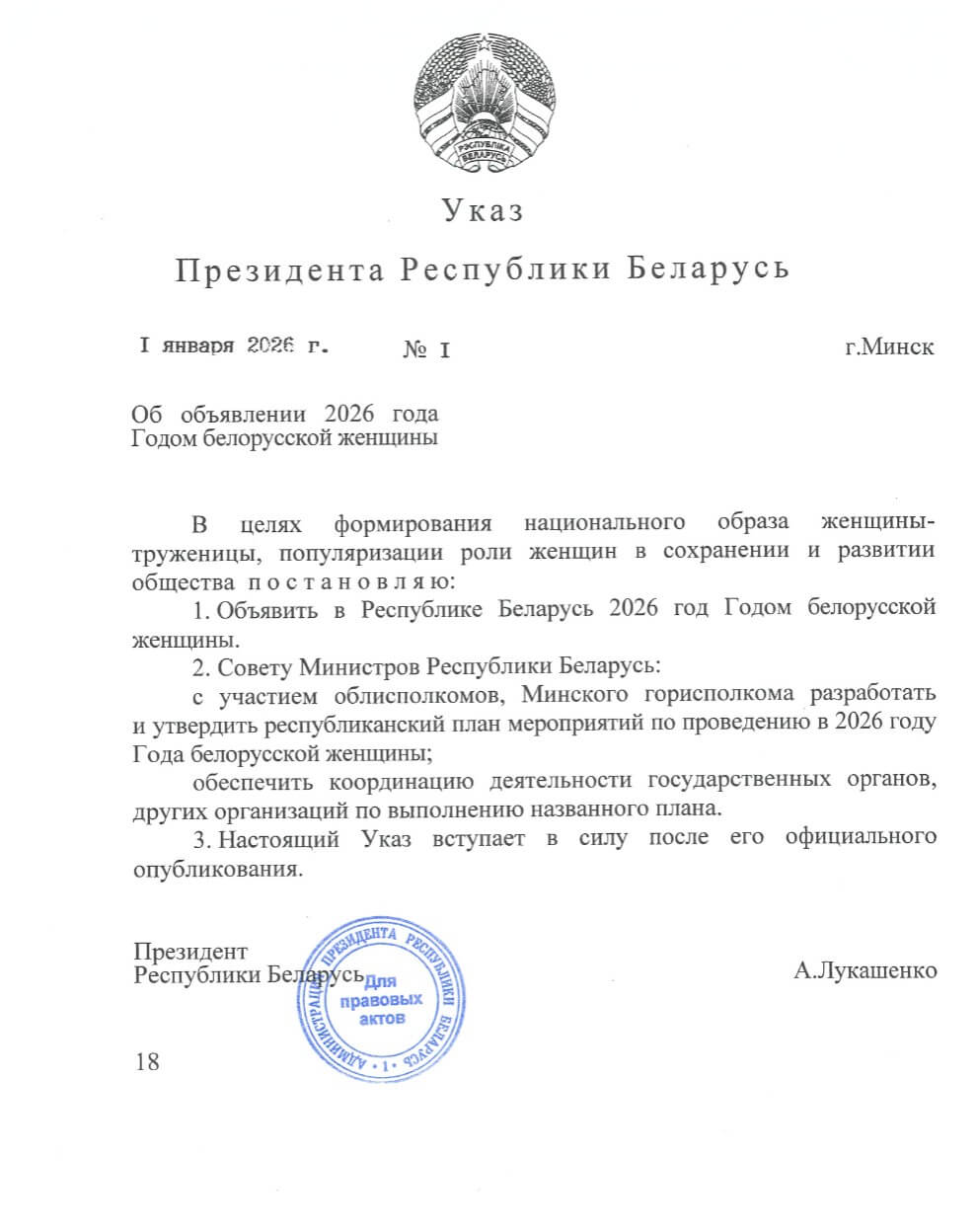 Президент Беларуси Александр Лукашенко подписал Указ № 1, которым 2026 год объявлен Годом белорусской женщины.