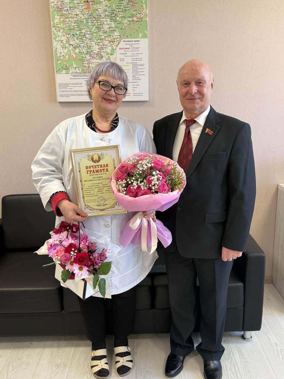 ВАЙНИЛОВИЧ Ириной совместно с председателем Березинской районной организации ветеранов Белорусского общественного объединения ветеранов ЗЯБКО Анатолием, поздравили с юбилеем врача-реабилитолога (заведующего) отделением медицинской реабилитации Березинской ЦРБ ПОЛОВЕЦ Евгению Калистратовну! 🎉 🎉